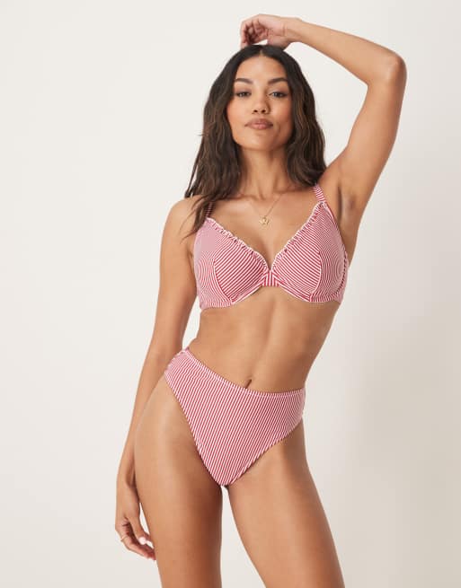 ASOS DESIGN – Anna – Seersucker-Bikinihose in gestreiftem Burgunderrot mit hohem Bund und hohem Beinausschnitt
