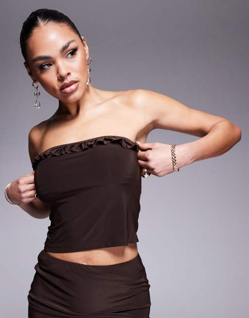 ASOS DESIGN – Anschmiegsames, trägerloses Oberteil in Braun mit Rüschenbesatz, Kombiteil