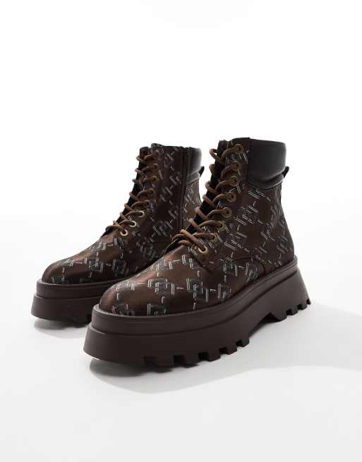 ASOS DESIGN – Arbeiter-Schnürstiefel in Braun mit Monogramm-Muster und dicker Sohle
