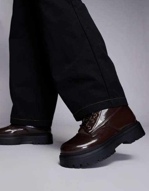 ASOS DESIGN – Arbeiter-Schnürstiefel in glänzendem Braun mit klobiger Sohle