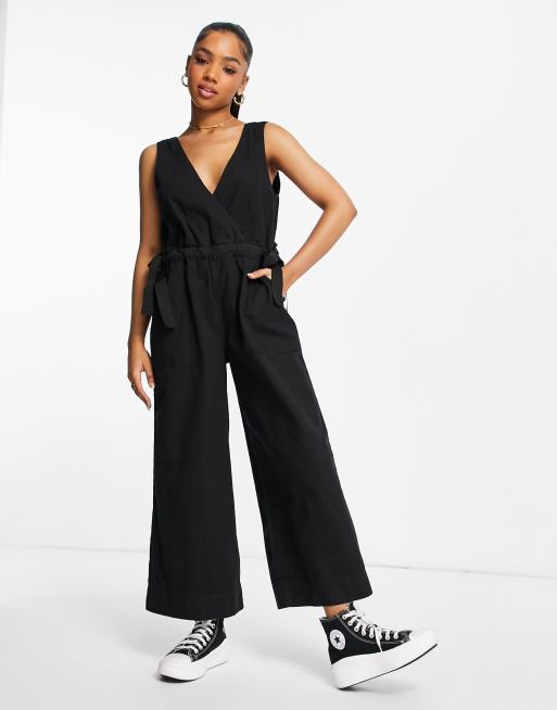 ASOS DESIGN – Ärmelloser Jumpsuit aus Twill in Schwarz mit Tunnelzug an der Taille