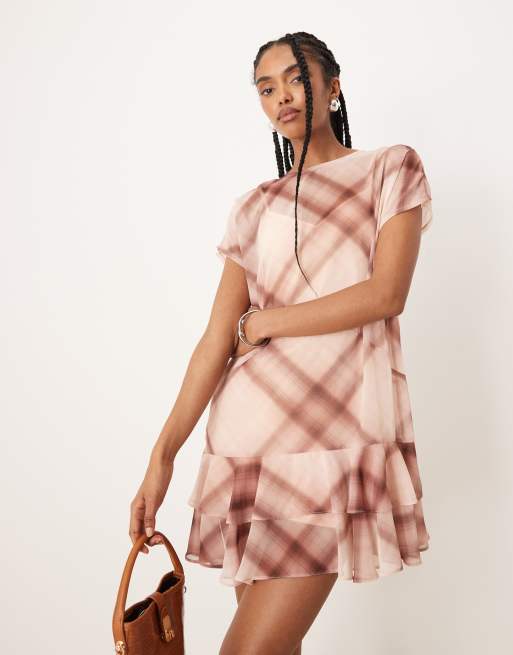 ASOS DESIGN – Ärmelloses, gerafftes Hängerkleid in Rosa kariert