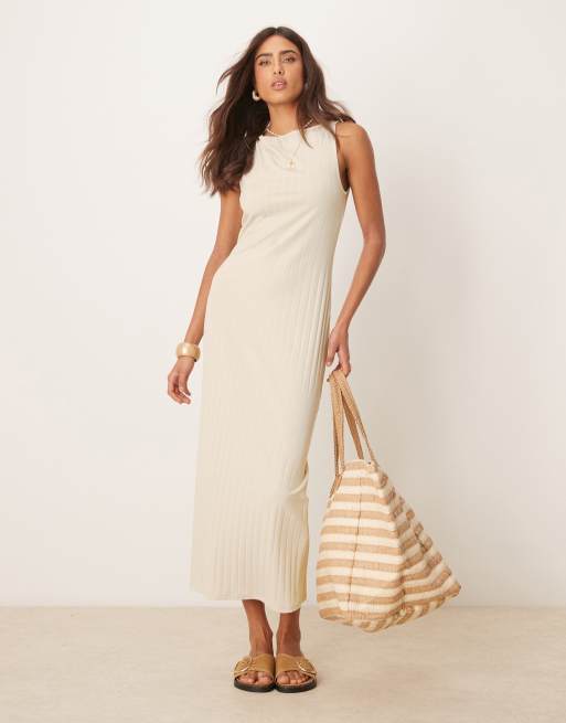 ASOS DESIGN – Ärmelloses Midikleid in Steinbeige mit U-Boot-Ausschnitt und breiter Rippenstruktur