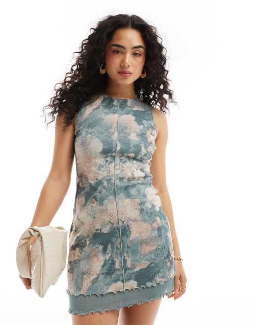 ASOS DESIGN – Ärmelloses Minikleid aus zweilagigem Netzstoff mit Ziernaht und grauem Marmormuster