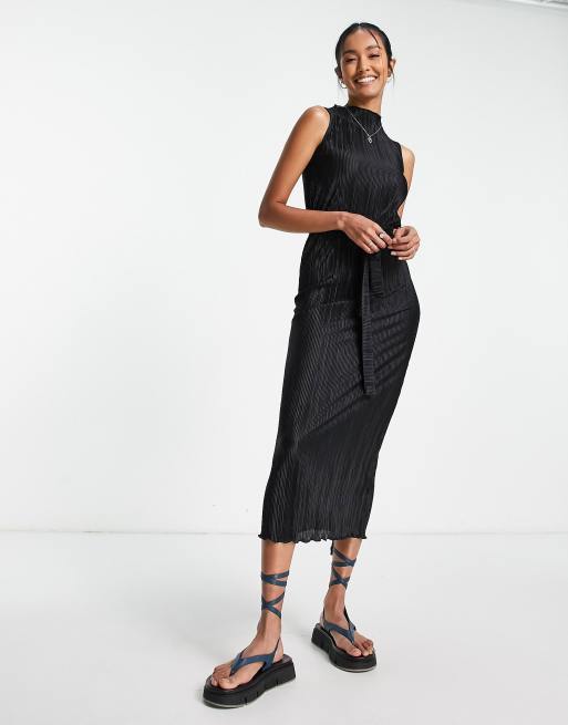 ASOS DESIGN – Ärmelloses, plissiertes Midikleid in Schwarz mit Gürtel