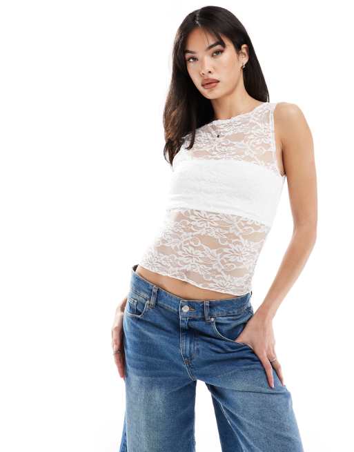 ASOS DESIGN – Ärmelloses Spitzen-Oberteil in Elfenbeinweiß mit U-Boot-Ausschnitt