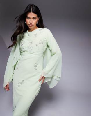 ASOS DESIGN – Asymmetrisches Maxikleid in Salbeigrün mit Wasserfallausschnitt, Blumen-Verzierung und Cape-Detail