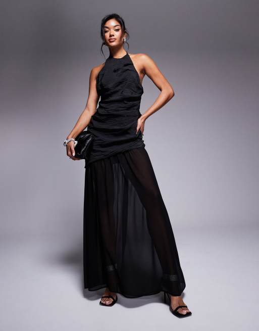 ASOS DESIGN – Asymmetrisches Maxikleid in Schwarz mit Neckholder, Rüschen und Rock aus aus Chiffon