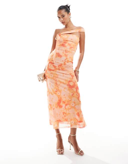 ASOS DESIGN – Asymmetrisches, trägerloses Netzstoff-Midikleid in Orange mit Blumenprint und Riemen-Detail