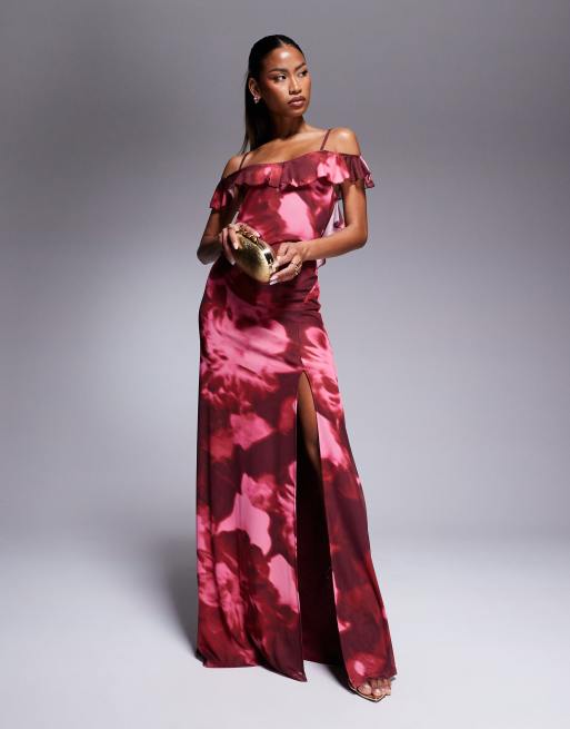 ASOS DESIGN – Bardot-Maxikleid in Rosa mit Blumenmuster aus gerafftem Netzstoff mit Seitenschlitz