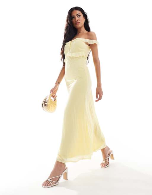 ASOS DESIGN – Bardot-Midikleid in Zitronengelb mit Rüschen und Schnürdetail