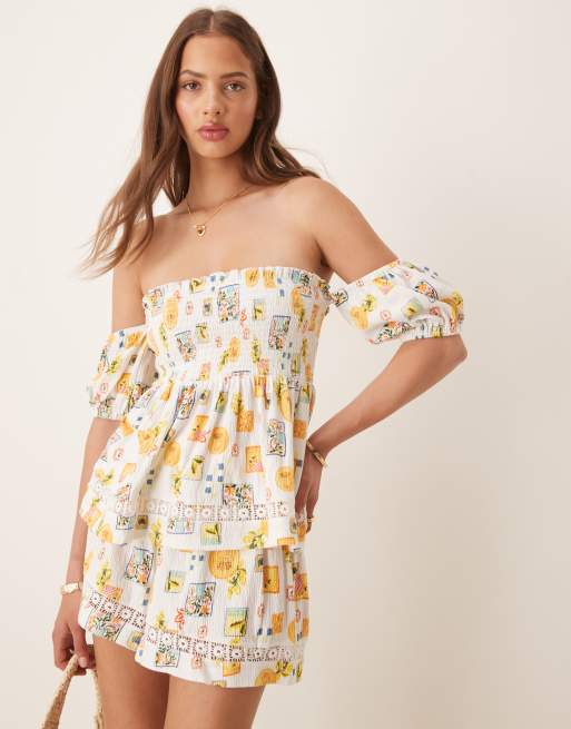 ASOS DESIGN – Bardot-Oberteil mit Postkartenprint und gesmoktem Detail