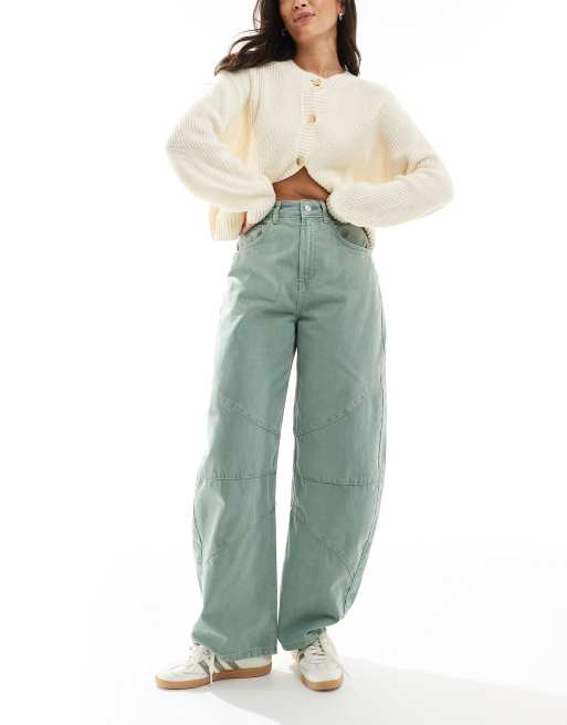 ASOS DESIGN – Barrel Jeans in Salbeigrün mit hoher Taille und Nahtdetail