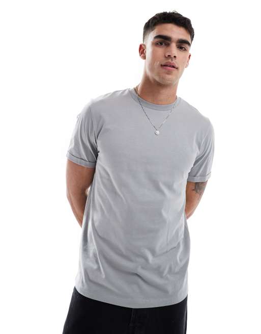 ASOS DESIGN – Basic-T-Shirt in Grau mit Rundhalsausschnitt und aufgerollten Ärmeln