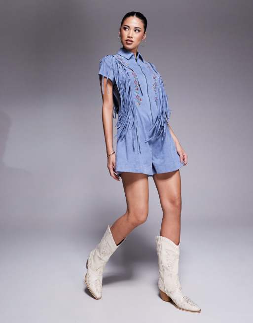 ASOS DESIGN – Bestickter Playsuit aus Wildlederimitat in Altblau mit Fransen