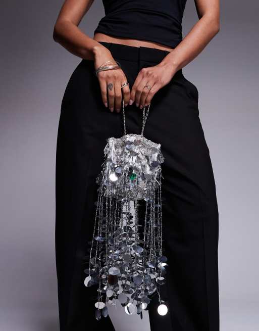 ASOS DESIGN – Beutel-Handtasche in Silberoptik mit Fransen und Pailletten