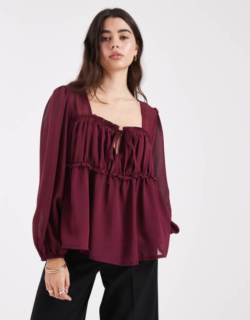 ASOS DESIGN – Bluse aus durchscheinendem Material in Burgunderrot mit Passe und gerafftem Detail