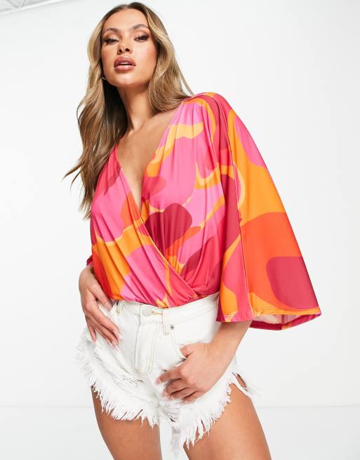 ASOS DESIGN – Body mit Flügelärmeln und abstraktem rosa Muster