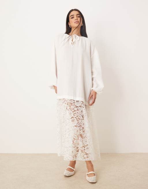 ASOS DESIGN – Boho-Tunika aus Stoff und Spitze in Cremeweiß