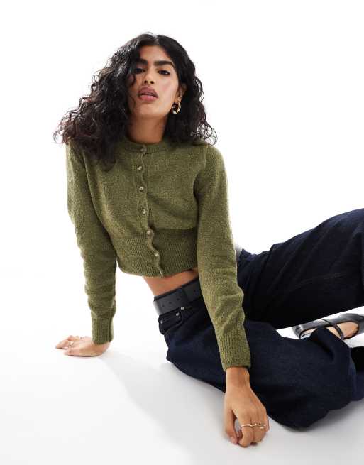 ASOS DESIGN – Bouclé-Strickjacke in Khaki mit Rundhalsausschnitt