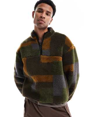 ASOS DESIGN – Boxy-Fit-Sweatshirt in Khaki aus Teddystoff mit kurzem Reißverschluss und abstraktem Print