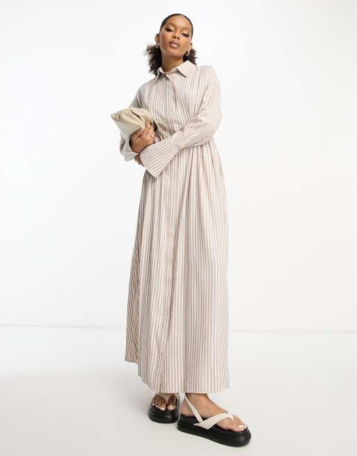 ASOS DESIGN – Braun gestreiftes Hemdblusenkleid in Maxilänge mit Biesen in der Taille