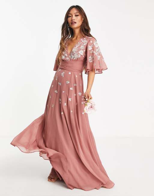 ASOS DESIGN Bridesmaid – Maxikleid mit Flatterärmeln, Wickeldesign an der Taille und farblich abgestimmter Blumenstickerei