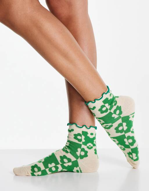 ASOS DESIGN – Bunte knöchelhohe Socken mit Blumen-Schachbrettmuster und Rüschensaum