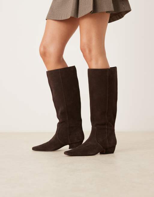 ASOS DESIGN – Calais – Kniehohe, flache Stiefel aus Wildleder in Schokobraun mit spitzer Zehenpartie