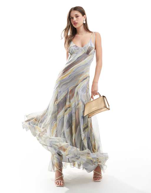 ASOS DESIGN – Camisole-Maxikleid mit freiliegendem Bustier, Godet-Design und abstraktem Muster