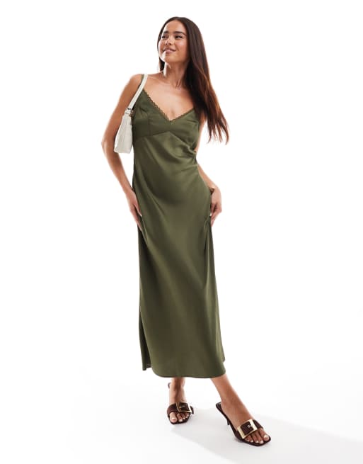 ASOS DESIGN – Camisole-Midikleid in Khaki mit Spitzenbesatz