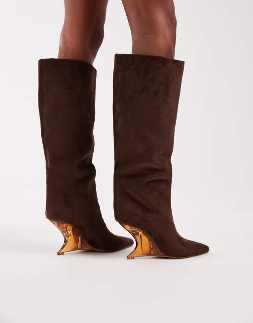 ASOS DESIGN – Cece – Kniehohe Stiefel zum Hineinschlüpfen aus Wildlederimitat in Schokobraun mit Keilabsatz