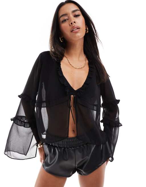 ASOS DESIGN – Chiffon-Bluse in Schwarz mit Rüschendetail