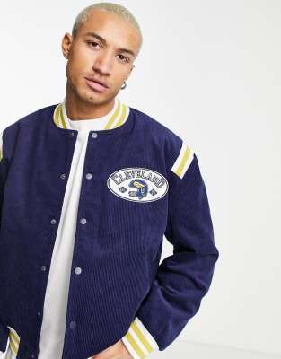 ASOS DESIGN – Cord-Bomberjacke im College-Stil in Marineblau mit farblich abgesetzter Ziernaht