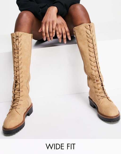 ASOS DESIGN – Courtney – Kniehohe Schnürstiefel mit dicker Sohle in Sand, weite Passform