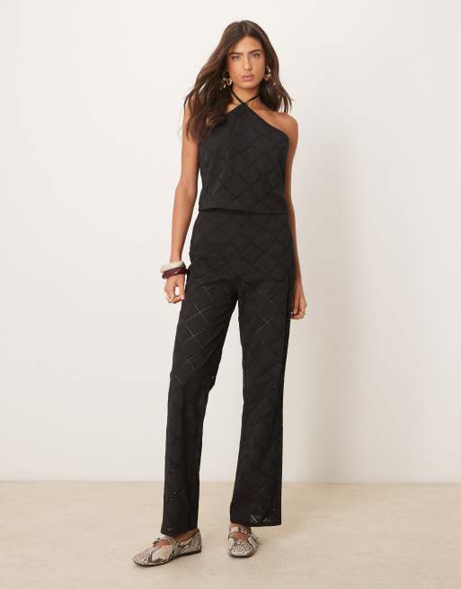 ASOS DESIGN – Cropped Neckholder-Oberteil und Hose in Schwarz mit durchbrochenem Muster als Set