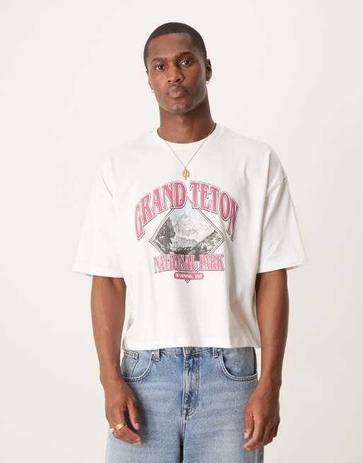 ASOS DESIGN – Cropped Oversize-T-Shirt in Weiß mit Landschafts-Print