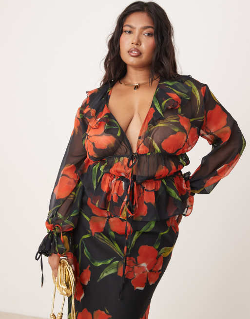 ASOS DESIGN Curve – Langärmliges Chiffon-Oberteil mit Rüschen, Bindedetail und Blumenmuster, Kombiteil