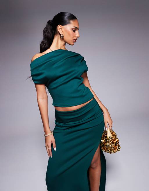 ASOS DESIGN Curve – Oberteil aus neoprenartigem Stoff in Tannengrün mit drapierter, abfallender Schulterpartie, Kombiteil