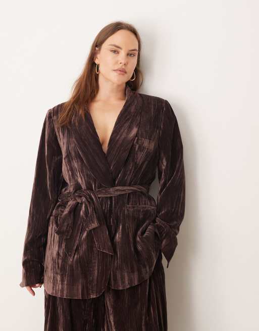 ASOS DESIGN Curve – Samtblazer in Schokobraun mit Taillengürtel, Kombiteil