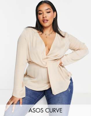 ASOS DESIGN Curve – Satinbluse mit verdrehter Vorderseite und ausgestellten Ärmeln in Champagner