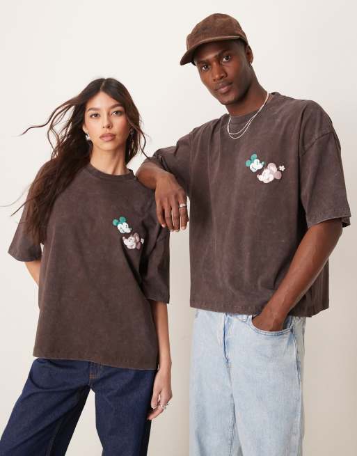 ASOS DESIGN – Disney – Kastiges Oversize-T-Shirt in verwaschenem Braun mit „Mickey and Minnie Mouse“-Print