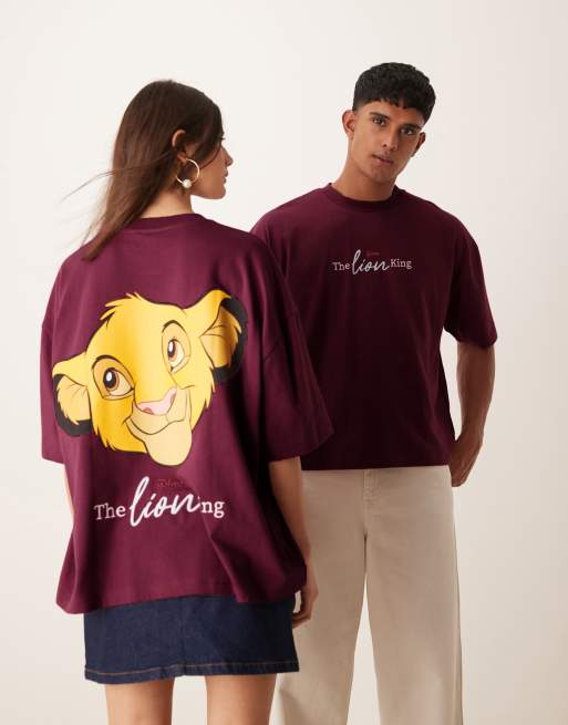 ASOS DESIGN – Disney – Kastiges Unisex-T-Shirt in Burgunderrot mit Oversize-Schnitt und „The Lion King“-Simba-Prints