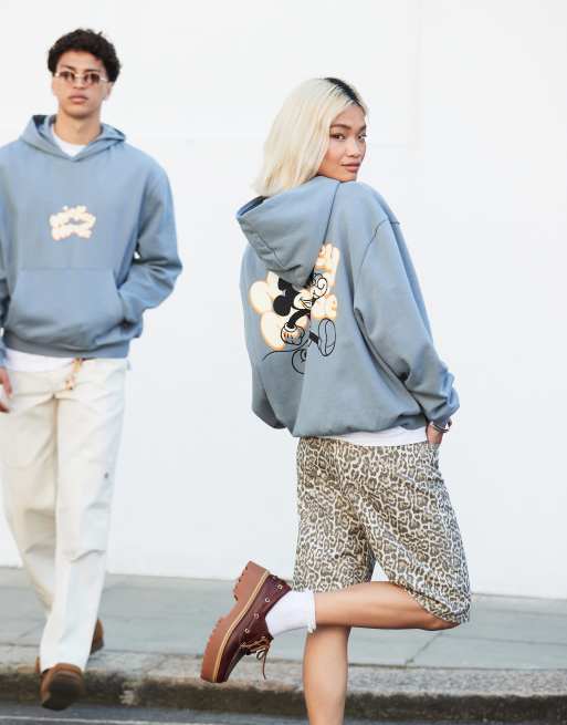 ASOS DESIGN – Disney – Unisex – Boxy Fit Kapuzenpullover in Grau mit „Micky Mouse“-Prints