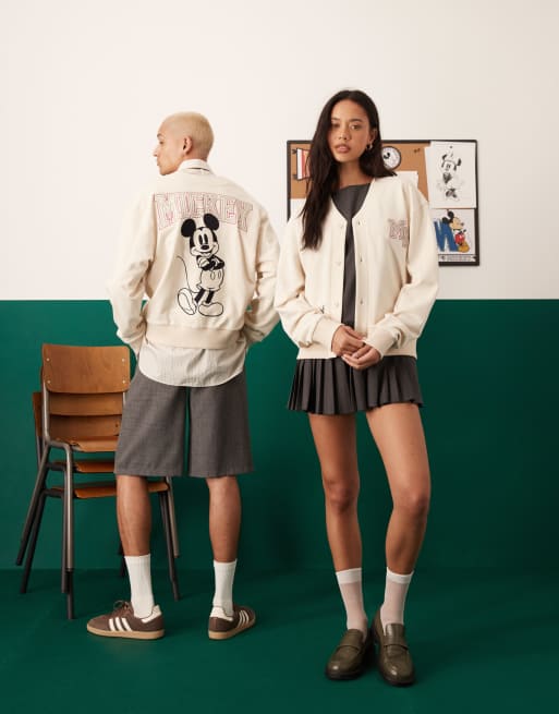 ASOS DESIGN – Disney – Unisex-Strickjacke in Beige mit aufgesticktem „Mickey Mouse“-Print und Oversize-Schnitt
