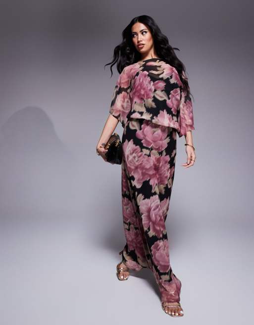 ASOS DESIGN – Drapiertes, gemustertes Maxikleid mit U-Boot-Ausschnitt und asymmetrischen Ärmeln