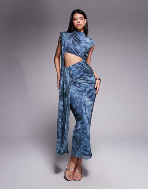 ASOS DESIGN – Drapiertes Maxikleid aus Netzstoff mit floralem Animalprint und Cut-out
