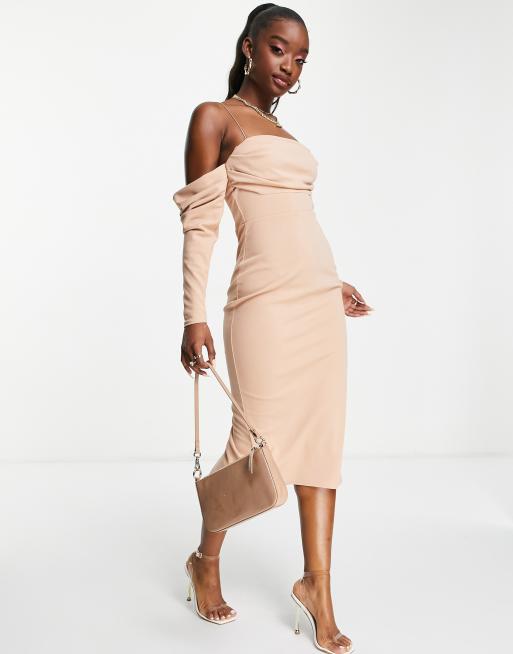 ASOS DESIGN – Drapiertes Midi-Bleistiftkleid in Nerzbraun mit Bardot-Ausschnitt