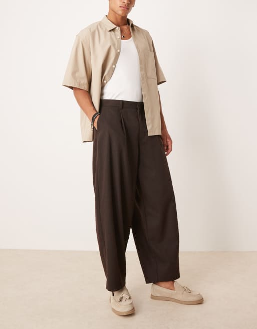ASOS DESIGN – Elegante Barrel-Hose aus Wollmix in Braun mit Fischgrätmuster und weitem Bein