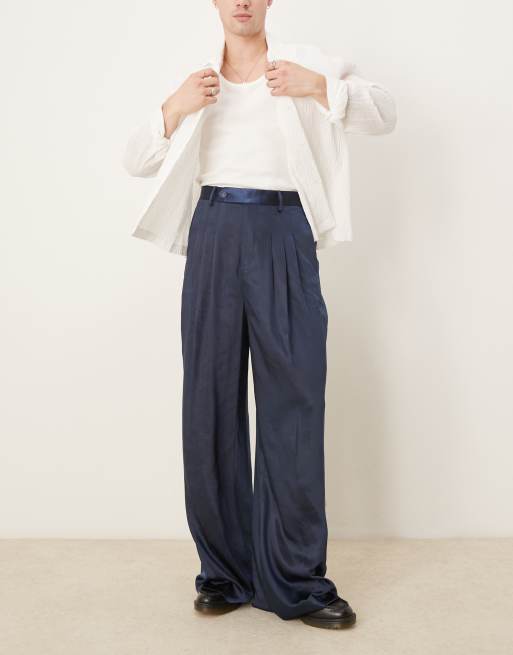 ASOS DESIGN – Elegante Hose aus Satin in Marineblau mit lockerem Beinschnitt und drei Bundfalten